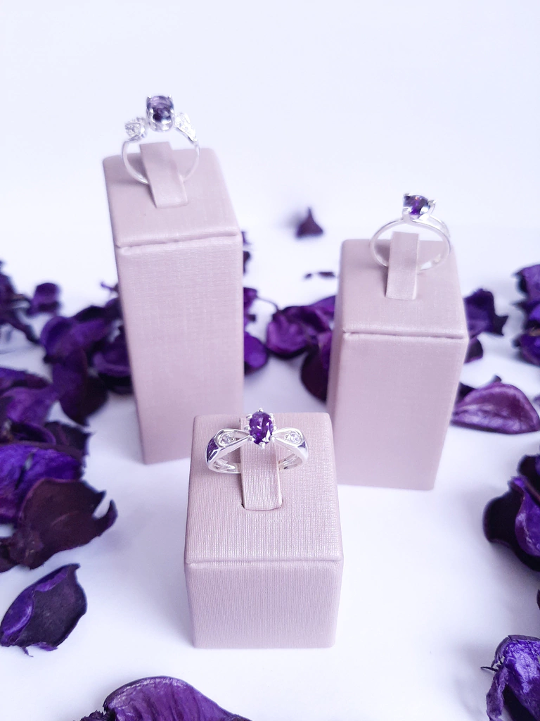 Ring with a side-leaf design, set with 5 zirconias on each side and 1 central purple zirconia.