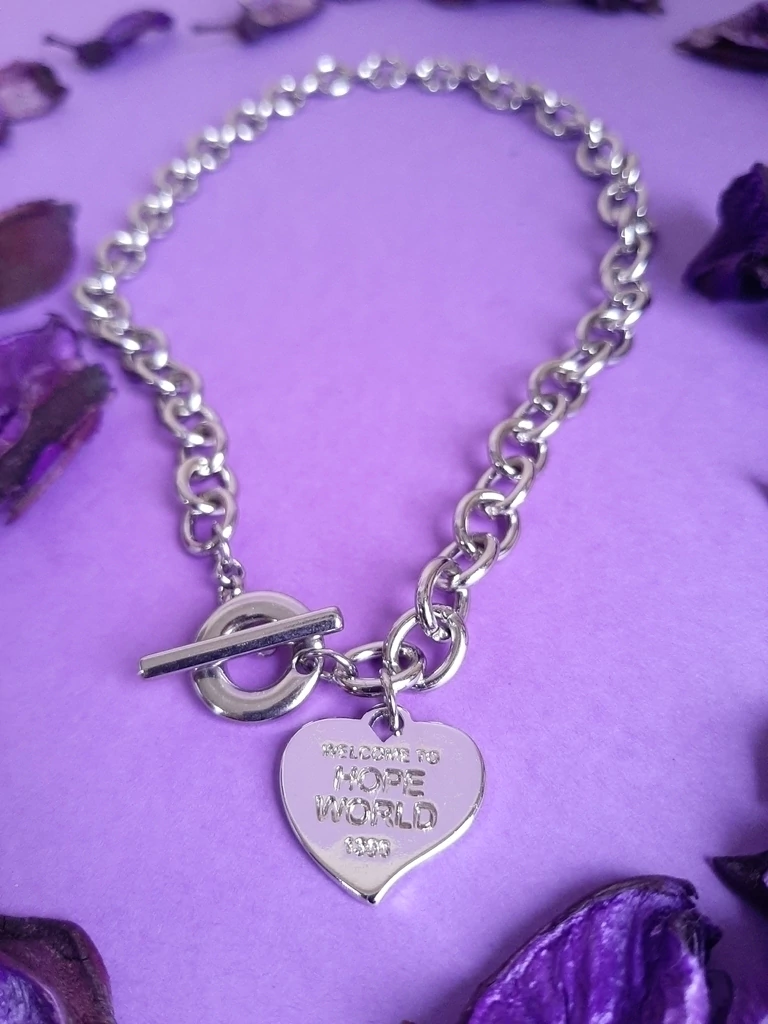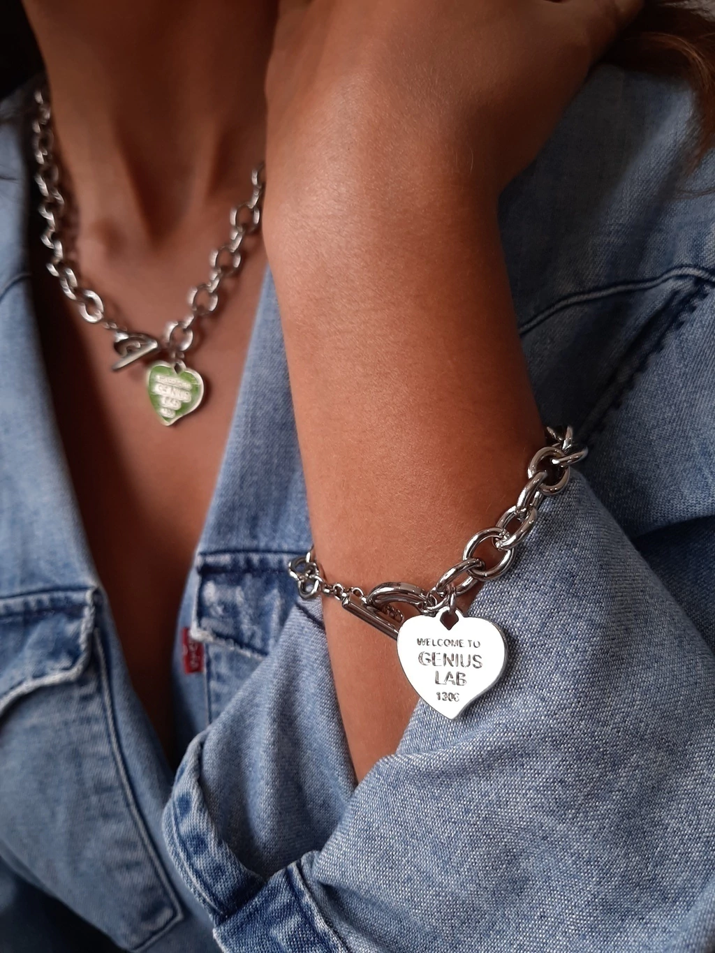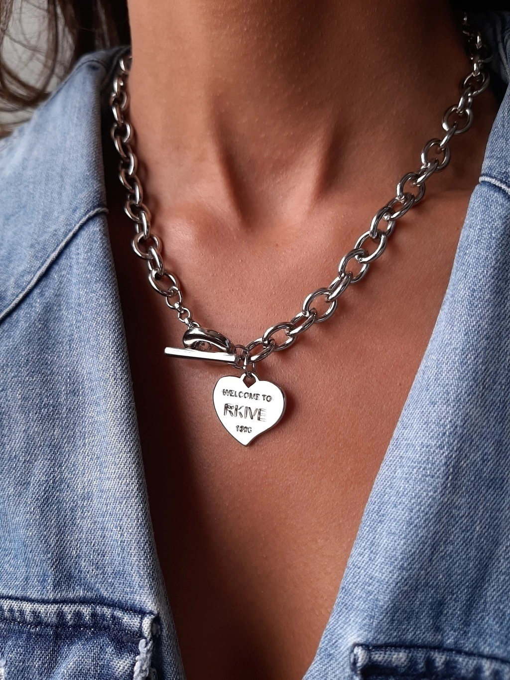 Portuguese link chain necklace with T-bar clasp and heart pendant engraved in low relief in 3 versions: RKIVE, GENIUS LAB, and HOPE WORLD.