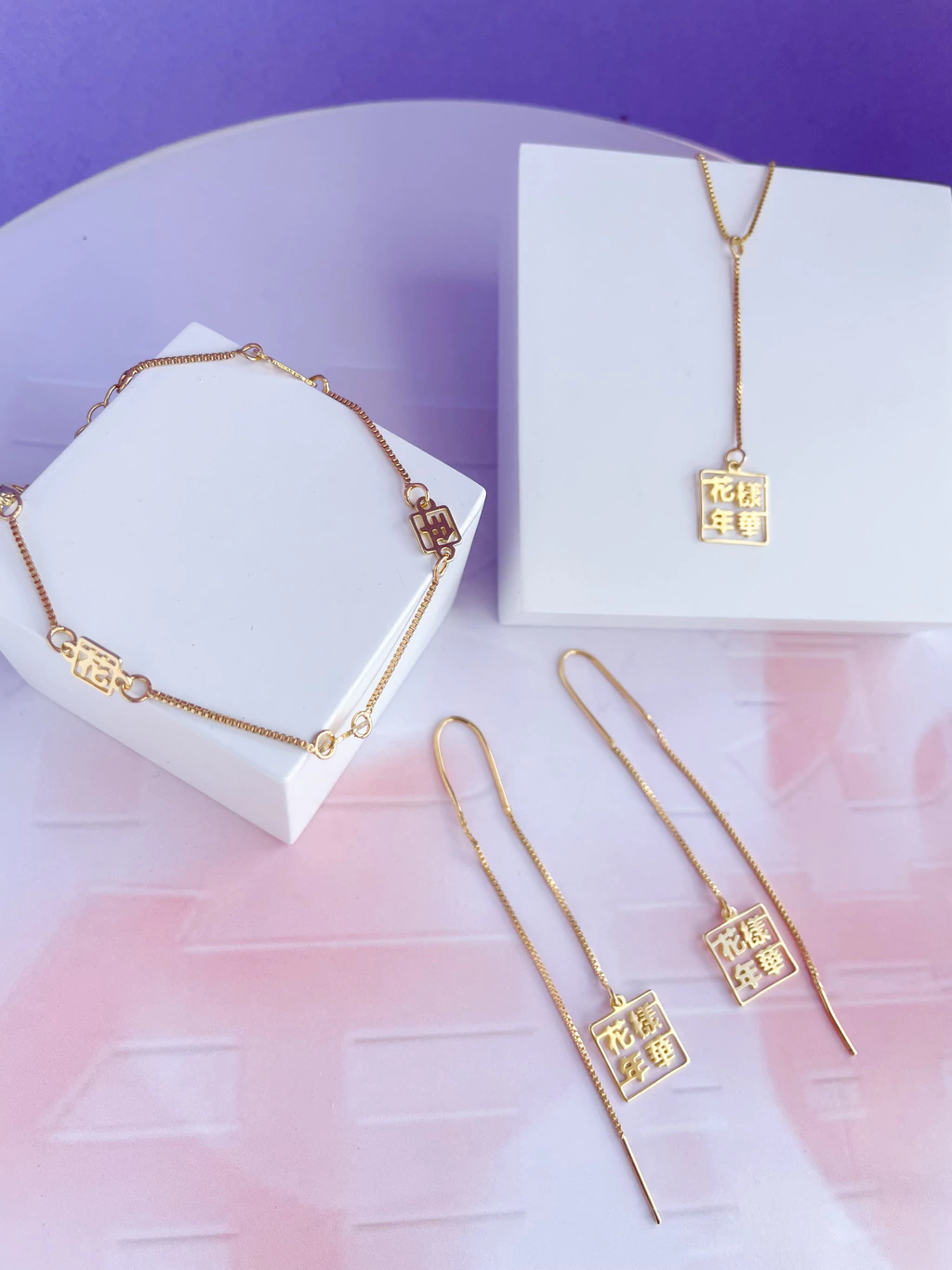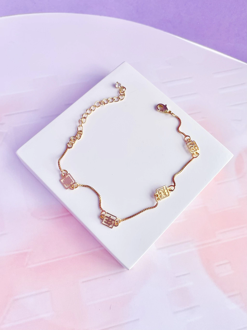 Venetian chain bracelet featuring Chinese characters that mean "the most beautiful moment in life." In Hangul: 화양연화. Plated with 50 mils of silver and 10 mils of gold.