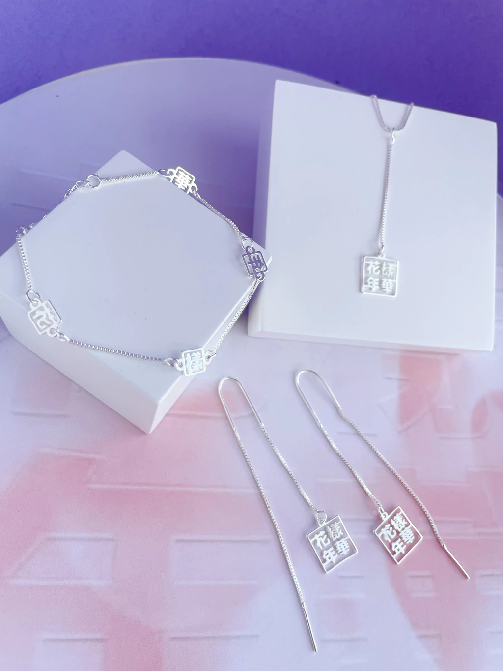 Lariat necklace with a Venetian chain and Chinese character design meaning the best moment in life. In Hangul: 화양연화. Plated in 50-mil silver and 10-mil gold.